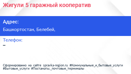 Жигули-5, гаражный кооператив по адресу Башкортостан, Белебей, в дальнейшем Организация, размещена в следующих категориях:
