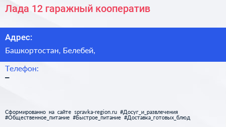 Лада-12, гаражный кооператив по адресу Башкортостан, Белебей, в дальнейшем Организация, размещена в следующих категориях: