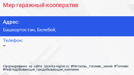 Мир, гаражный кооператив по адресу Башкортостан, Белебей, в дальнейшем Организация, размещена в следующих категориях: