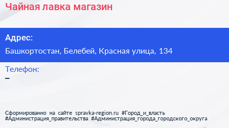 Чайная лавка, магазин по адресу Башкортостан, Белебей, Красная улица, 134 в дальнейшем Организация, размещена в следующих категориях: