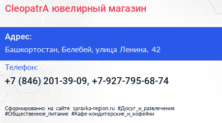 CleopatrA, ювелирный магазин по адресу Башкортостан, Белебей, улица Ленина, 42 в дальнейшем Организация, размещена в следующих категориях: