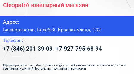 CleopatrA, ювелирный магазин по адресу Башкортостан, Белебей, Красная улица, 132 в дальнейшем Организация, размещена в следующих категориях: