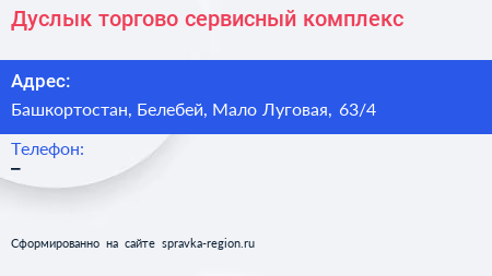 Дуслык, торгово-сервисный комплекс по адресу Башкортостан, Белебей, Мало Луговая, 63/4 в дальнейшем Организация, размещена в следующих категориях: