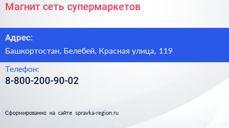 Магнит, сеть супермаркетов по адресу Башкортостан, Белебей, Красная улица, 119 в дальнейшем Организация, размещена в следующих категориях: