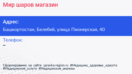 Мир шаров, магазин по адресу Башкортостан, Белебей, улица Пионерская, 40 в дальнейшем Организация, размещена в следующих категориях: