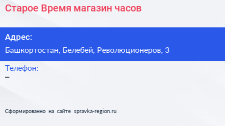 Старое Время, магазин часов по адресу Башкортостан, Белебей, Революционеров, 3 в дальнейшем Организация, размещена в следующих категориях: