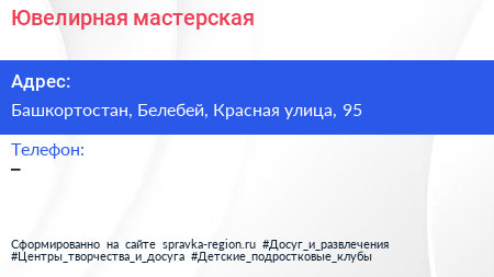 Ювелирная мастерская по адресу Башкортостан, Белебей, Красная улица, 95 в дальнейшем Организация, размещена в следующих категориях: