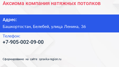 Аксиома, компания натяжных потолков по адресу Башкортостан, Белебей, улица Ленина, 36 в дальнейшем Организация, размещена в следующих категориях: