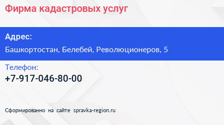 Фирма кадастровых услуг по адресу Башкортостан, Белебей, Революционеров, 5 в дальнейшем Организация, размещена в следующих категориях: