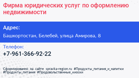Фирма юридических услуг по оформлению недвижимости по адресу Башкортостан, Белебей, улица Амирова, 8 в дальнейшем Организация, размещена в следующих категориях: