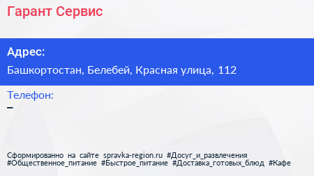 Гарант-Сервис по адресу Башкортостан, Белебей, Красная улица, 112 в дальнейшем Организация, размещена в следующих категориях: