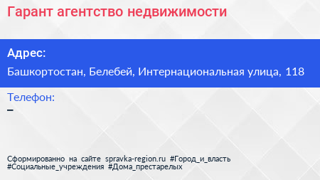 Гарант, агентство недвижимости по адресу Башкортостан, Белебей, Интернациональная улица, 118 в дальнейшем Организация, размещена в следующих категориях: