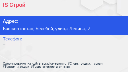 IS-Строй по адресу Башкортостан, Белебей, улица Ленина, 7 в дальнейшем Организация, размещена в следующих категориях: