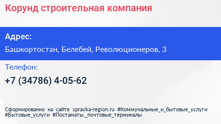 Корунд, строительная компания по адресу Башкортостан, Белебей, Революционеров, 3 в дальнейшем Организация, размещена в следующих категориях: