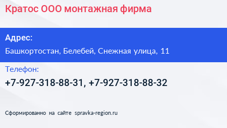 Кратос, ООО, монтажная фирма по адресу Башкортостан, Белебей, Снежная улица, 11 в дальнейшем Организация, размещена в следующих категориях: