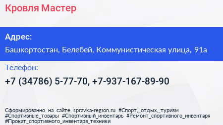 Кровля Мастер по адресу Башкортостан, Белебей, Коммунистическая улица, 91а в дальнейшем Организация, размещена в следующих категориях: