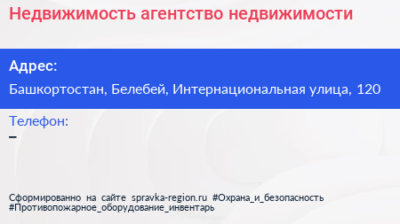 Недвижимость, агентство недвижимости по адресу Башкортостан, Белебей, Интернациональная улица, 120 в дальнейшем Организация, размещена в следующих категориях: