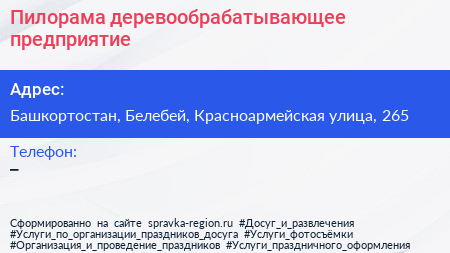 Пилорама, деревообрабатывающее предприятие по адресу Башкортостан, Белебей, Красноармейская улица, 265 в дальнейшем Организация, размещена в следующих категориях: