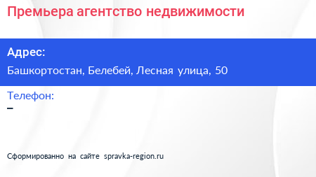 Премьера, агентство недвижимости по адресу Башкортостан, Белебей, Лесная улица, 50 в дальнейшем Организация, размещена в следующих категориях: