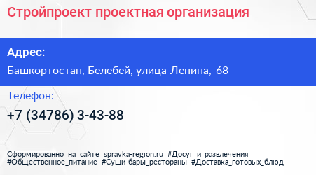Стройпроект, проектная организация по адресу Башкортостан, Белебей, улица Ленина, 68 в дальнейшем Организация, размещена в следующих категориях: