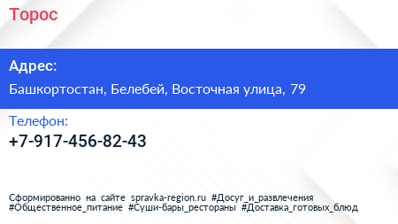 Торос по адресу Башкортостан, Белебей, Восточная улица, 79 в дальнейшем Организация, размещена в следующих категориях: