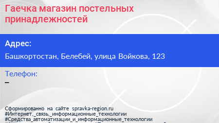 Гаечка, магазин постельных принадлежностей по адресу Башкортостан, Белебей, улица Войкова, 123 в дальнейшем Организация, размещена в следующих категориях: