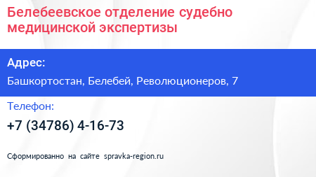 Белебеевское отделение судебно-медицинской экспертизы по адресу Башкортостан, Белебей, Революционеров, 7 в дальнейшем Организация, размещена в следующих категориях: