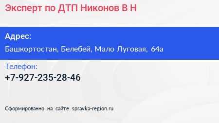 Эксперт по ДТП Никонов В.Н. по адресу Башкортостан, Белебей, Мало Луговая, 64а в дальнейшем Организация, размещена в следующих категориях:
