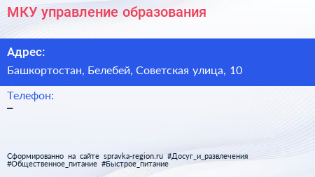 МКУ управление образования по адресу Башкортостан, Белебей, Советская улица, 10 в дальнейшем Организация, размещена в следующих категориях: