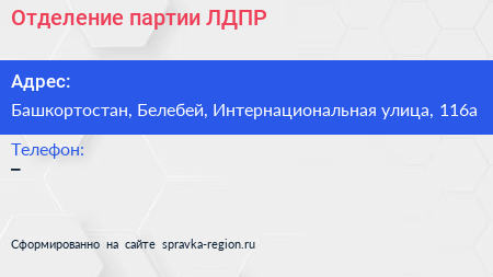 Отделение партии ЛДПР по адресу Башкортостан, Белебей, Интернациональная улица, 116а в дальнейшем Организация, размещена в следующих категориях: