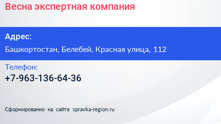 Весна, экспертная компания по адресу Башкортостан, Белебей, Красная улица, 112 в дальнейшем Организация, размещена в следующих категориях: