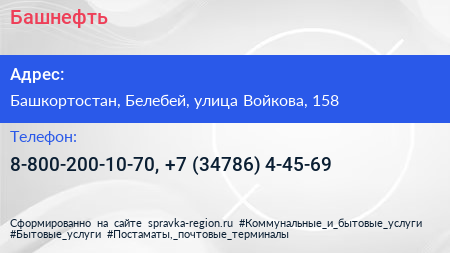 Башнефть по адресу Башкортостан, Белебей, улица Войкова, 158 в дальнейшем Организация, размещена в следующих категориях: