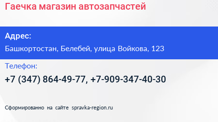Гаечка, магазин автозапчастей по адресу Башкортостан, Белебей, улица Войкова, 123 в дальнейшем Организация, размещена в следующих категориях: