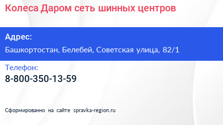 Колеса Даром, сеть шинных центров по адресу Башкортостан, Белебей, Советская улица, 82/1 в дальнейшем Организация, размещена в следующих категориях: