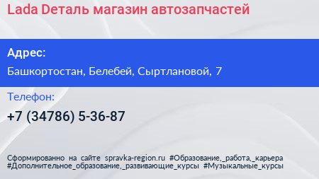 Lada Deталь, магазин автозапчастей по адресу Башкортостан, Белебей, Сыртлановой, 7 в дальнейшем Организация, размещена в следующих категориях: