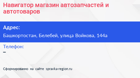 Навигатор, магазин автозапчастей и автотоваров по адресу Башкортостан, Белебей, улица Войкова, 144а в дальнейшем Организация, размещена в следующих категориях: