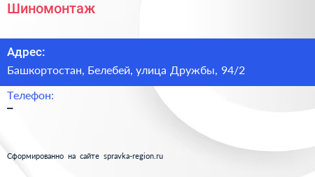 Шиномонтаж по адресу Башкортостан, Белебей, улица Дружбы, 94/2 в дальнейшем Организация, размещена в следующих категориях: