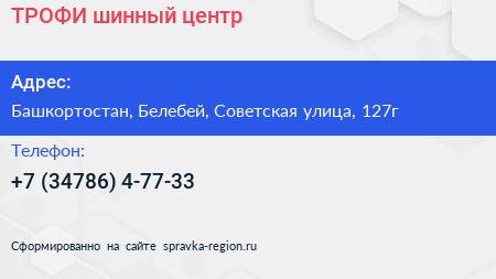 ТРОФИ, шинный центр по адресу Башкортостан, Белебей, Советская улица, 127г в дальнейшем Организация, размещена в следующих категориях: