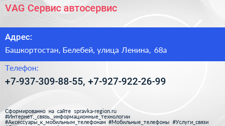 VAG Сервис, автосервис по адресу Башкортостан, Белебей, улица Ленина, 68а в дальнейшем Организация, размещена в следующих категориях: