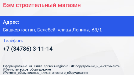 Бэм, строительный магазин по адресу Башкортостан, Белебей, улица Ленина, 68/1 в дальнейшем Организация, размещена в следующих категориях: