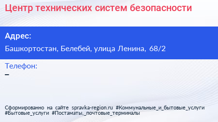 Центр технических систем безопасности по адресу Башкортостан, Белебей, улица Ленина, 68/2 в дальнейшем Организация, размещена в следующих категориях: