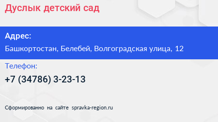 Дуслык, детский сад по адресу Башкортостан, Белебей, Волгоградская улица, 12 в дальнейшем Организация, размещена в следующих категориях: