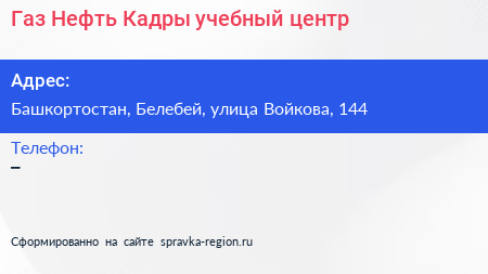 Газ-Нефть Кадры, учебный центр по адресу Башкортостан, Белебей, улица Войкова, 144 в дальнейшем Организация, размещена в следующих категориях: