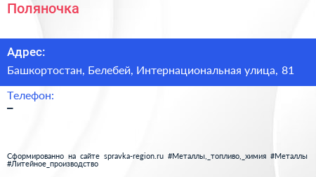 Поляночка по адресу Башкортостан, Белебей, Интернациональная улица, 81 в дальнейшем Организация, размещена в следующих категориях:
