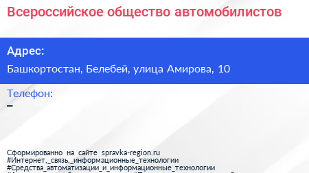Всероссийское общество автомобилистов по адресу Башкортостан, Белебей, улица Амирова, 10 в дальнейшем Организация, размещена в следующих категориях: