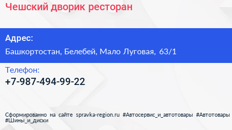 Чешский дворик, ресторан по адресу Башкортостан, Белебей, Мало Луговая, 63/1 в дальнейшем Организация, размещена в следующих категориях: