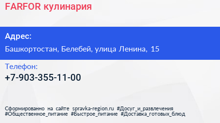 FARFOR, кулинария по адресу Башкортостан, Белебей, улица Ленина, 15 в дальнейшем Организация, размещена в следующих категориях: