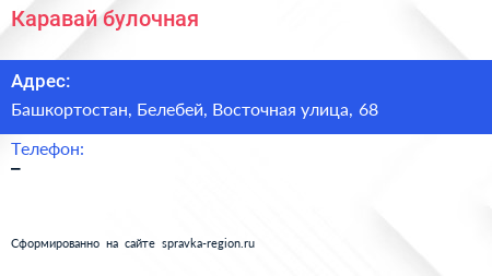 Каравай, булочная по адресу Башкортостан, Белебей, Восточная улица, 68 в дальнейшем Организация, размещена в следующих категориях: