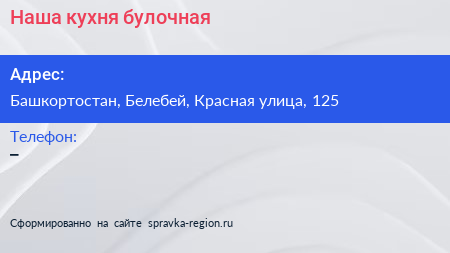 Наша кухня, булочная по адресу Башкортостан, Белебей, Красная улица, 125 в дальнейшем Организация, размещена в следующих категориях: