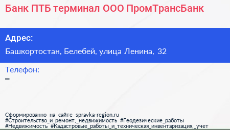 Банк ПТБ, терминал, ООО ПромТрансБанк по адресу Башкортостан, Белебей, улица Ленина, 32 в дальнейшем Организация, размещена в следующих категориях: